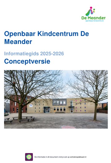 Een veilige en vertrouwde plek voor opvang en onderwijs onder één dak: dat biedt Openbaar Kindcentrum De Meander aan kinderen van 2 – 13 jaar. Bij ons leren kinderen vanuit spel en onderzoek de wereld verkennen. Zij werken, spelen en ontwikkelen zich in een fijne sfeer. En volgen de stroom, ieder op zijn eigen manier. Om te ontdekken dat in elke bocht zich een nieuwe wereld openbaart. Op dit moment is het niet mogelijk om voor schooljaar 2025-2026 een leerling aan te melden voor de leerjaren 4 en 5. Deze groepen zitten vol. Hiervoor hebben wij wel een wachtlijst.