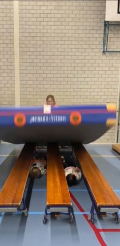 Vandaag hebben wij bij gym iets superspannends gedaan. Er stonden banken naast elkaar met wat ruimte ertussen. Daar mochten twee leerlingen tussen gaan liggen. Aan de korte kant van de banken stond een grote dikke mat op z'n korte kant. Een leerling mocht deze dan omduwen op de banken en er direct ook op vallen. Maar wel eerst wachten op een seintje van de juf, want je moet natuurlijk wel plat liggen! Oei, wie durft dit ook?