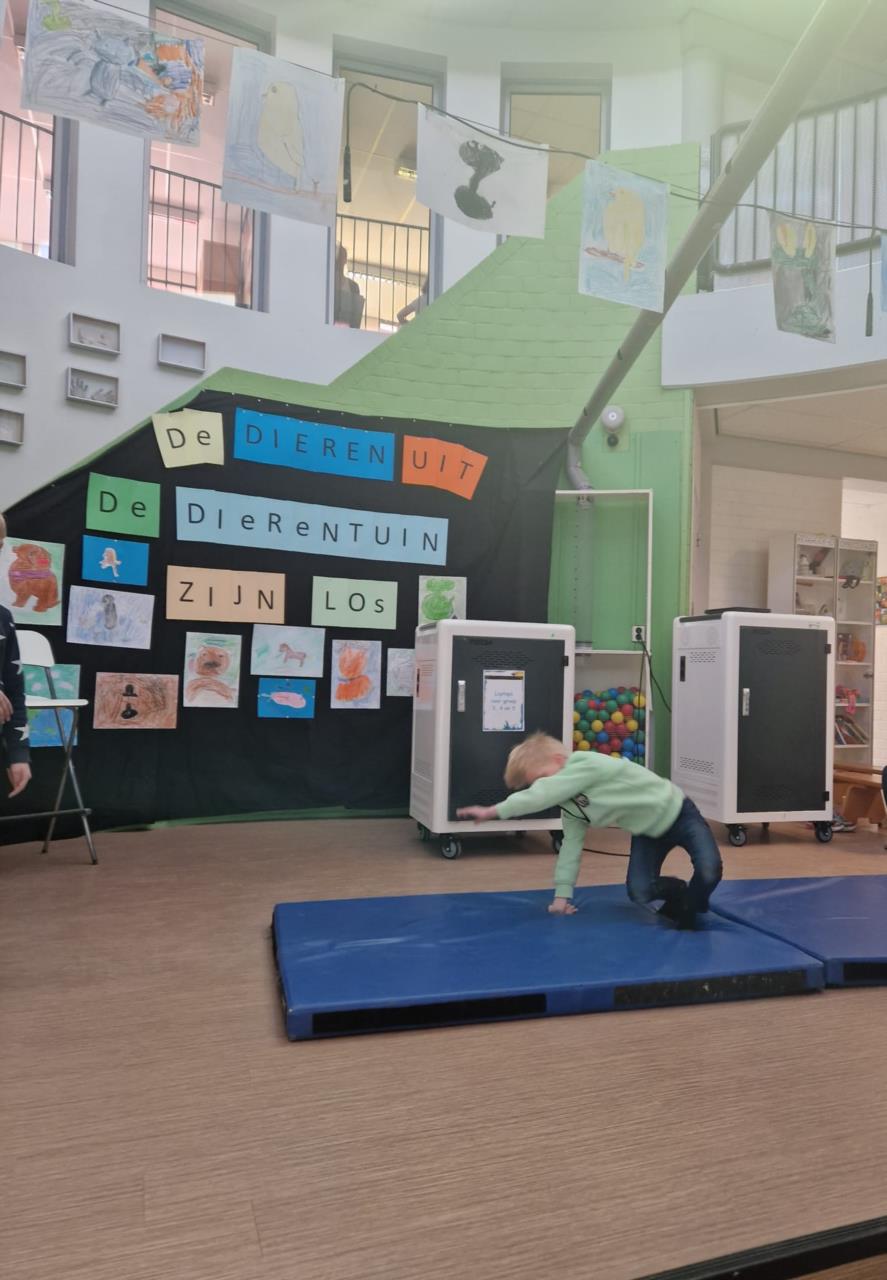 De dieren uit de dierentuin zijn los! Dat is de naam van ons Meander theater, die wij afgelopen week hebben opgevoerd voor onze ouders en de hele school. De afgelopen maanden hebben wij hard geoefend en het was nu eindelijk tijd om al onze dansjes, liedjes, trucjes en het toneelstuk te laten zien. Alle dieren waren erbij, wat vonden wij het leuk!